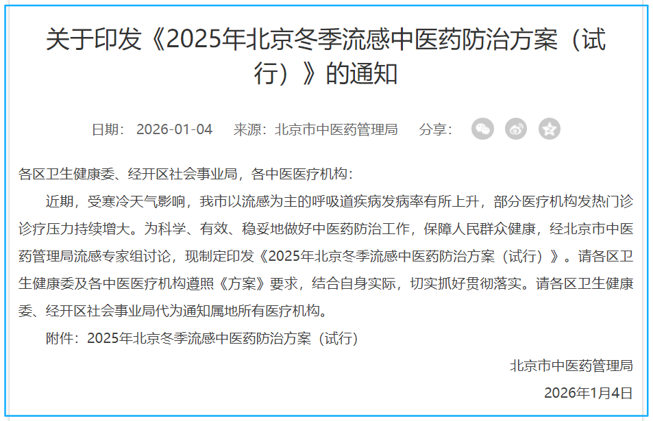 北京发布流感中医药防治方案 连花清瘟等中成药获推荐网络2026-01-05 16:55