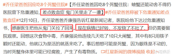 而这一次乔爸吃变质螃蟹住院,也有不少粉丝留言祈福,并提醒以后一定要注意身体。